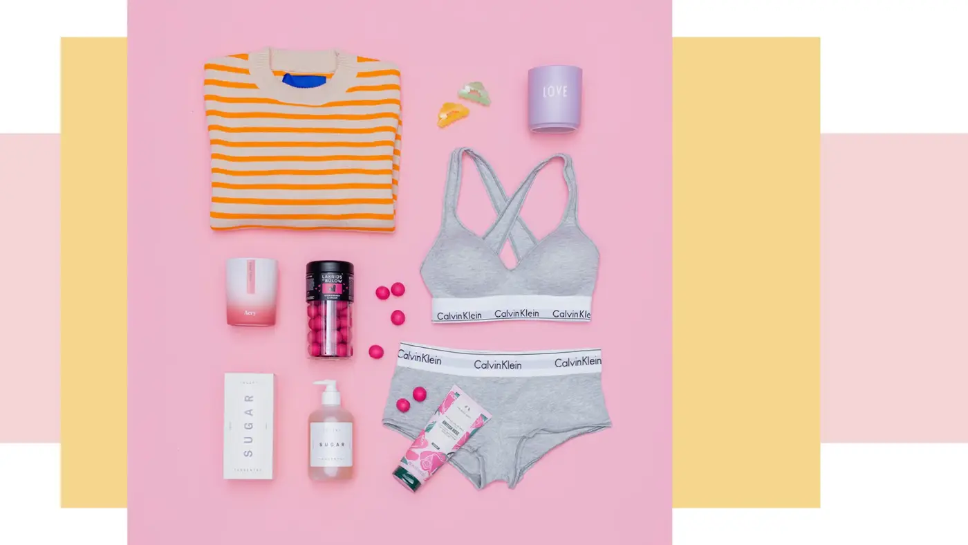Genser kr 1599,- fra Résumé/Brando Woman// Love-kopp kr 249,- fra Design Letters/ARK// Hårklyper kr 90 stk fra Brando Woman// Truse kr 250,- fra Calvin Klein/Auds undertøysalong// Topp kr 500,- fra Calvin Klein/Auds undertøysalong// Lakriskuler kr 200,- fra Lakrids Bulow/Backe i Grensen// British Rose bodylotion kr 169,- fra The Body Shop// SUGAR såpe kr 250,- fra Brando Woman// Duftlys kr 499,- fra Aery/Brando Woman