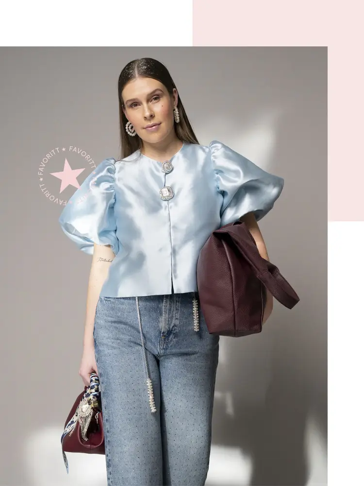 Asleigh: Bluse, Follestad kr 2499,- // Jeans, Høyer kr 2400,- // Brosjer, Me and My Cousin kr 1899,-/2199,-/3199,- // Smykke brukt som belte, Me and My Cousin kr 3199,- // Øredobber, Me and My Cousin kr 1899,- // Sko, Høyer kr 2799,- // Veske (liten), Follestad kr 3599,- // Veske (stor), Lindex kr 399,- // Skjerf, Olivias Verden kr 499,-