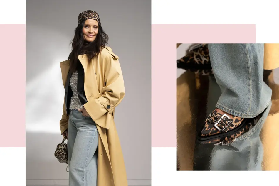 Superfresht, og noe jeg ikke visste at jeg ville komme til å gå i, sier Line, om sjalet stylisten knytet rundt hodet hennes. Leopardmønsteret holder seg fremdeles superaktuelt, også i tilbehøret.