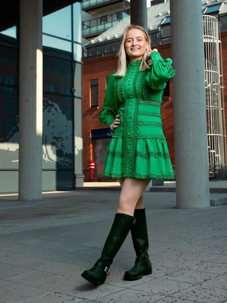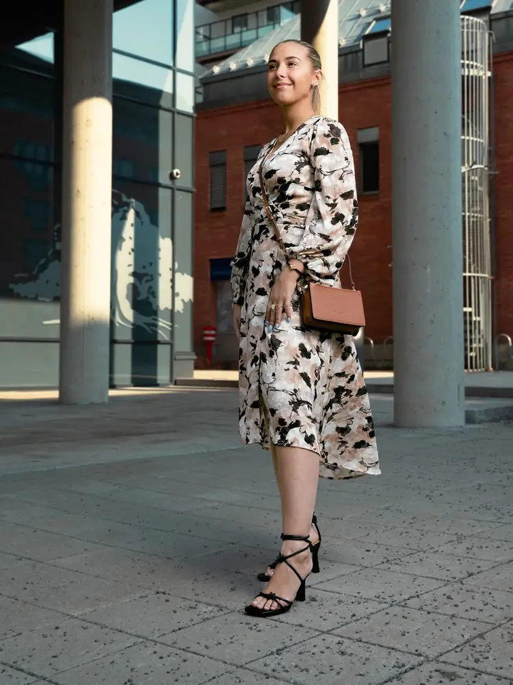 – Kjolen vi viser her er stylet med superfreshe sko fra Flattered og utgjør til sammen et nydelig antrekk til sommerfest, dåp og bryllup. Samtidig kan du tone ned stilen eller bryte opp uttrykket med en skinnjakke og et par sneakers til. Kjolen får du både i denne fargen og i en nydelig gulfarge. Vi hjelper deg gjerne med å finne kjolen til din anledning!